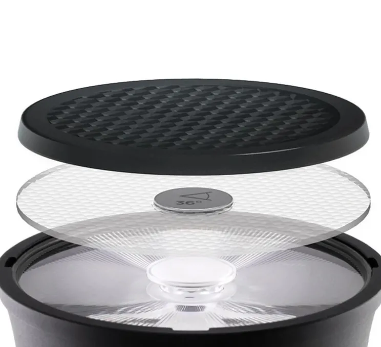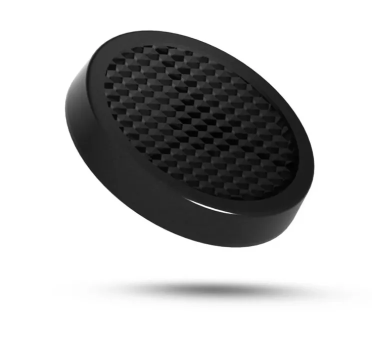Sa forme circulaire d’un diamètre de 5,11 cm et d’une hauteur de 0,9 cm s’habille d’un maillage en nid d’abeille. Sa finition noire laisse deviner une structure interne fine et précise qui se fond visuellement tout en maîtrisant la diffusion lumineuse.