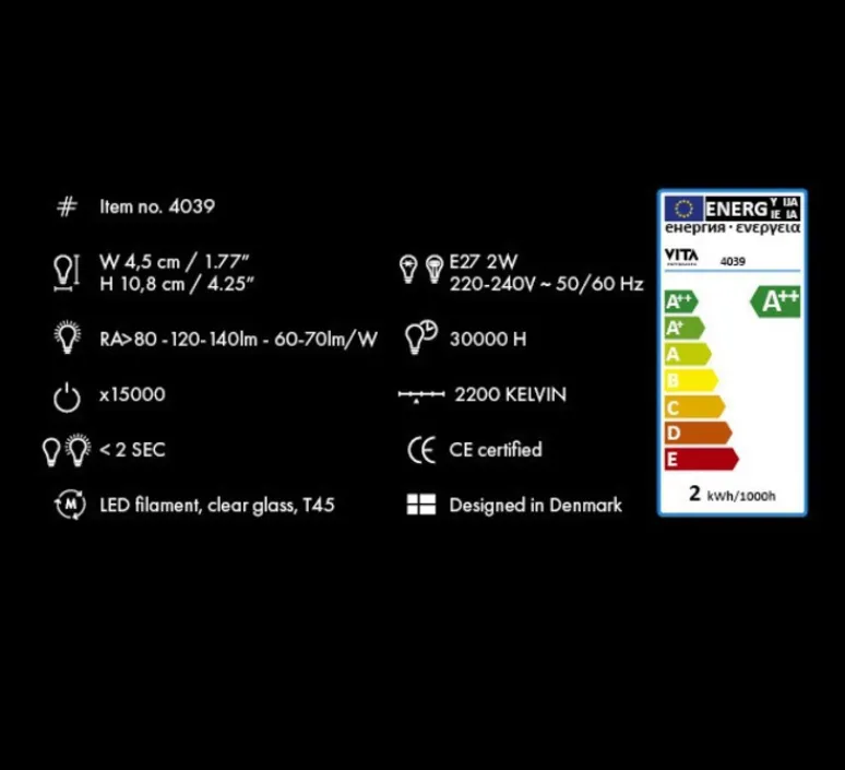 Cette ampoule de 2W dispose d’un cri supérieur ou égal à 80, d’une température chaude de 2200K et d’une intensité lumineuse de 120 à 140Lm.