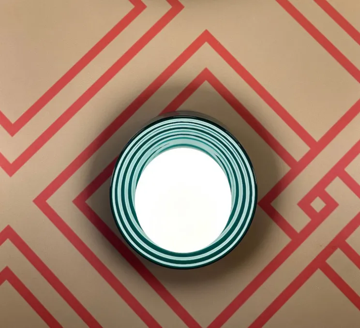 La finition émeraude, vibrante et profonde, contraste avec la douceur du globe en verre opale. Sa forme circulaire et texturée, marquée de sillons rappelant les disques vinyles, évoque un style Memphis affirmé.