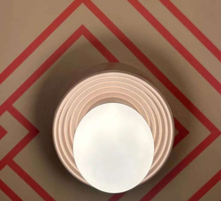 La finition taupe apporte un ton neutre qui s’associe parfaitement avec la douceur du globe en verre opale. Sa forme circulaire et texturée, marquée de sillons rappelant les disques vinyles, évoque un style Memphis affirmé.