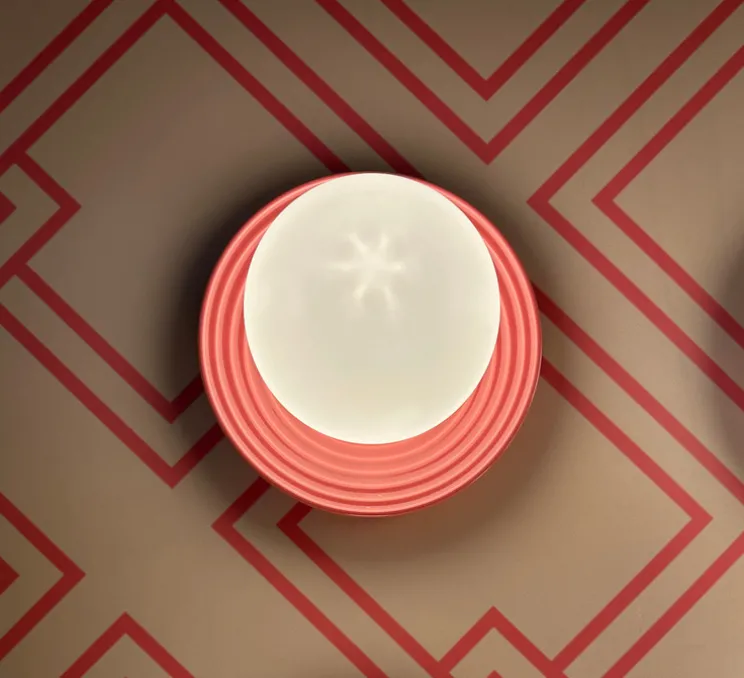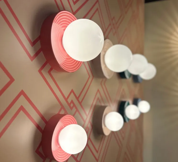 La finition rose apporte une touche de peps qui vient subtilement contraster avec la douceur du globe en verre opale. Sa forme circulaire et texturée, marquée de sillons rappelant les disques vinyles, évoque un style Memphis affirmé.