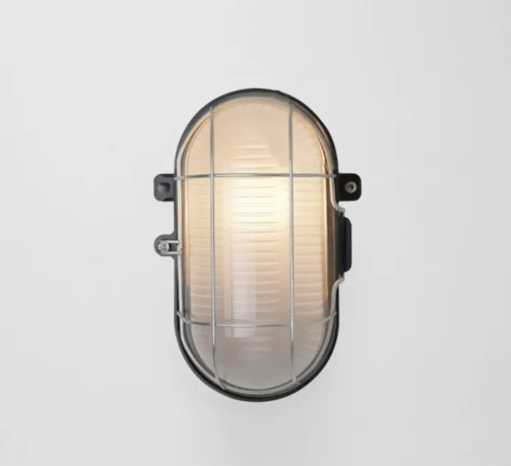 Cette lampe intemporelle trouve aussi bien sa place dans une salle de bain que dans une buanderie, dans un garage que sur une terrasse. Elle est composée d’un socle en bakélite, d’un verre strié et d’une cage en métal.