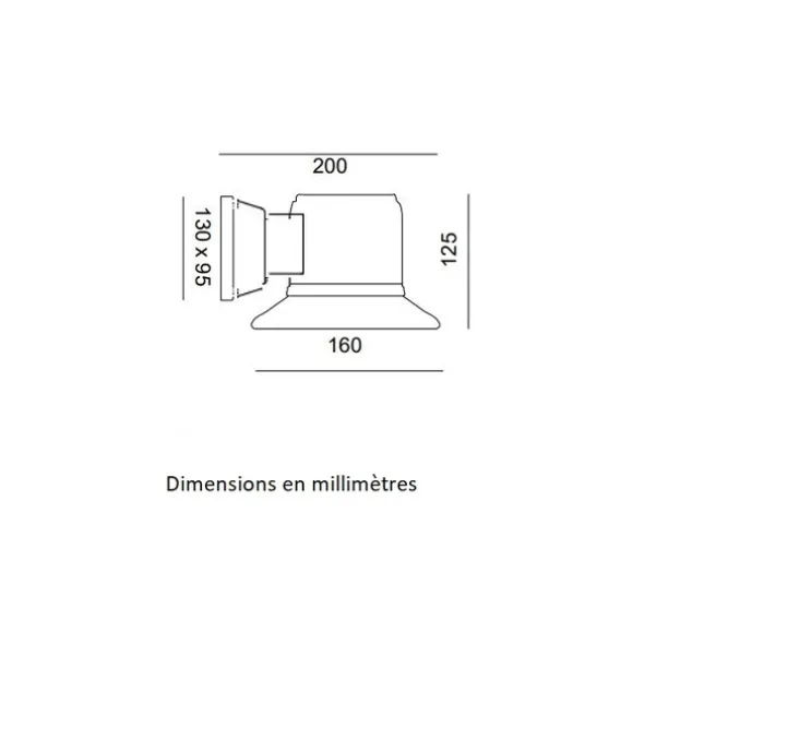 L’applique mesure 12,5 cm de hauteur, 16 cm de diamètre et 20 cm de profondeur. La base mesure 13 cm x 9,5 cm.