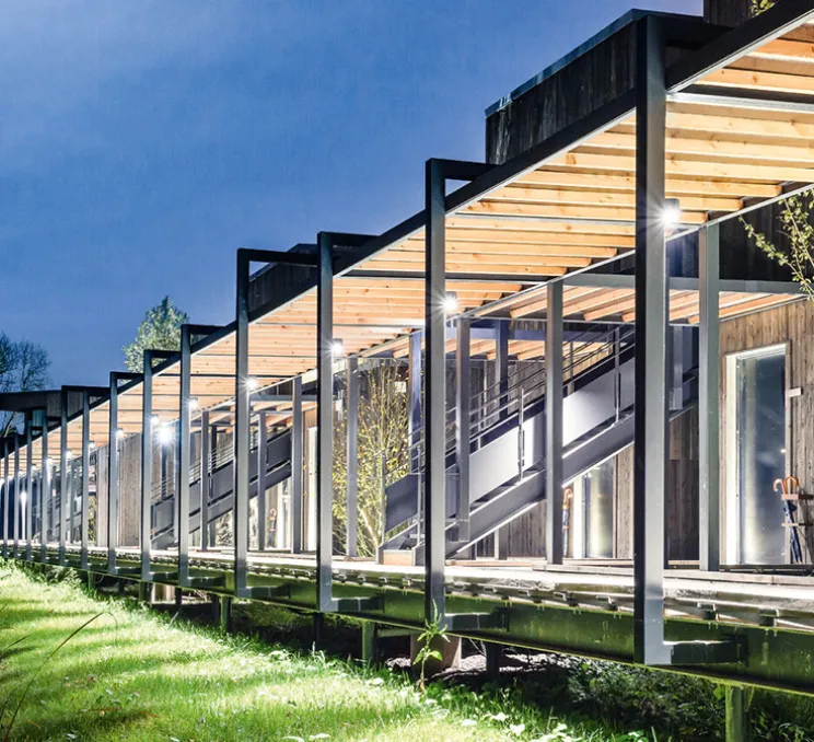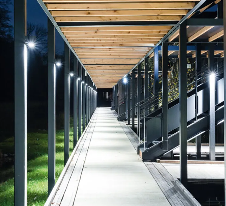Tube 1.0 LED se monte sur un mur extérieur. Une distance de sécurité de 30 centimètres est nécessaire entre chaque lampe. Le luminaire éclaire vers le bas ou vers le haut. Son faisceau est de 36°.