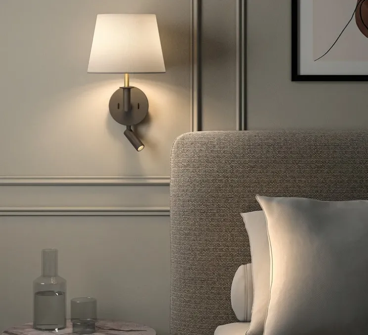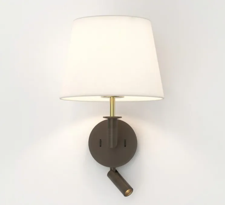 Ce luminaire mural mêle subtilement métal bronze, laiton naturel et textile blanc, pour une solution d’éclairage élégante et fonctionnelle, idéale pour l’hôtellerie haut de gamme.