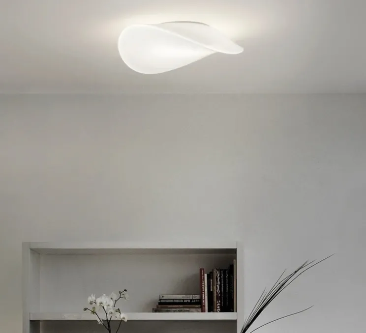 Son diffuseur en verre soufflé blanc brillant et ses courbes aériennes la rende parfaite pour une installation dans un couloir, une chambre ou un salon pour créer un point lumineux à la fois graphique et discret.