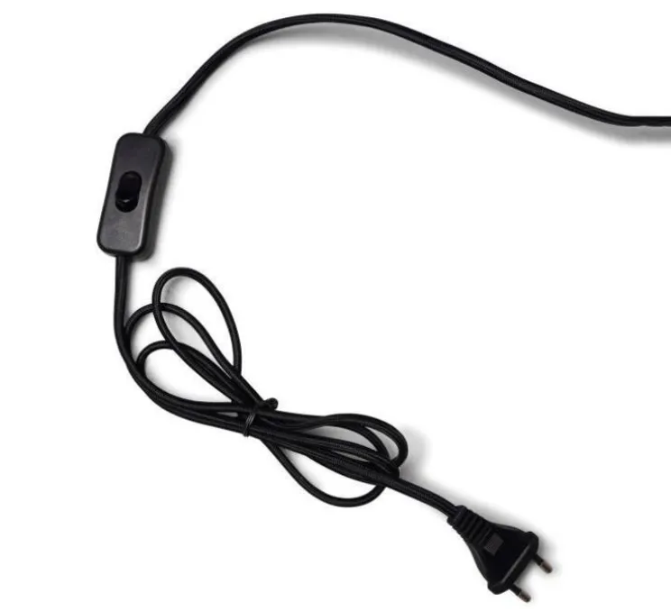 L’abat-jour mesure 27 cm de diamètre et 32 cm de hauteur. Le câble, en textile noir, mesure 2,5 mètres de long avec un bouton ON/OFF.