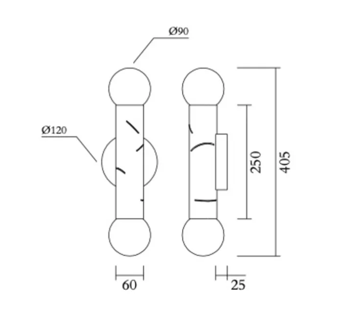 Cette applique murale mesure 40,5cm de hauteur et 12cm de longueur et les globes ont un diamètre de 9cm.