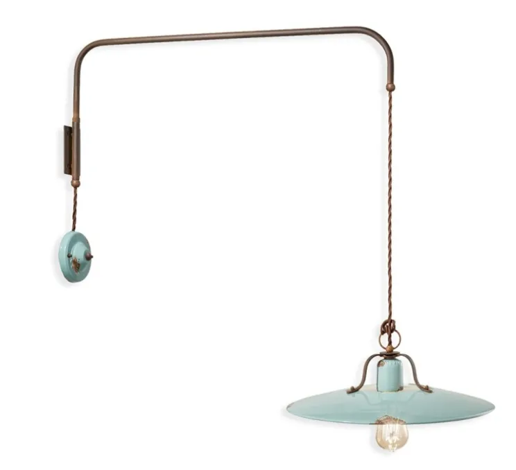 Il se présente sous la forme d’une applique à bras rotative au bout de laquelle est suspendue un abat-jour bleu. Le bras de l’applique est orientable à 180° ce qui ajoute un aspect pratique et fonctionnel à ce luminaire.