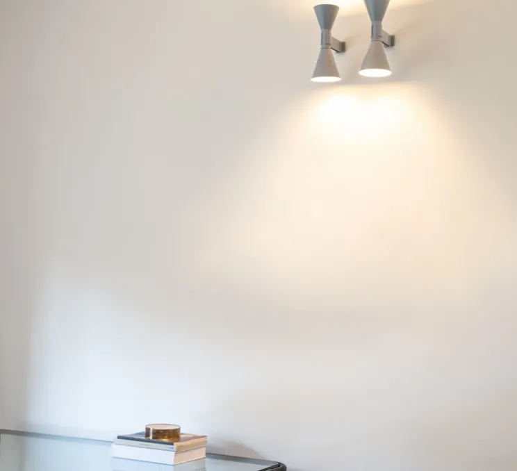 L’applique murale iconique a un éclairage direct et diffus. Ses deux diffuseurs en forme de cône dirigent la lumière vers le haut et vers le bas en créant des faisceaux lumineux homogènes et nets.