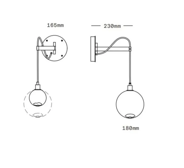La sphère en verre mesure 18 cm de diamètre, le bras articulé en laiton mesure 23cm et le câble noir en textile ajustable mesure 1,8m.