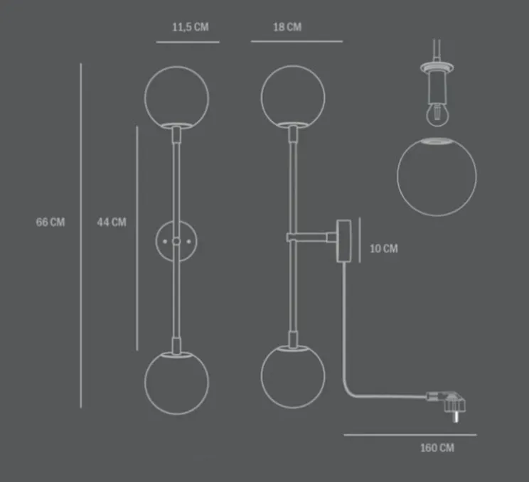 La source est non incluse, nous préconisons une ampoule E14. L’applique mesure 65cm de hauteur pour un diamètre de 18cm.