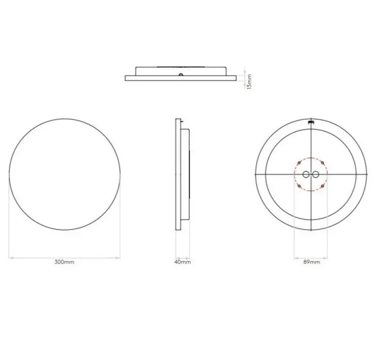 Eclipse Round 300 Led mesure 30 cm de diamètre et 4 cm de profondeur. Le module Led intégré a une puissance de 12,6W et diffuse 597 lumens avec une colorimétrie de 3000K. Ce luminaire n’est pas variable mais est compatible avec l’option « Smart Lighting » grâce aux accessoires Casambi. Driver non requis. Possède un IRC de 80. Montage mural.