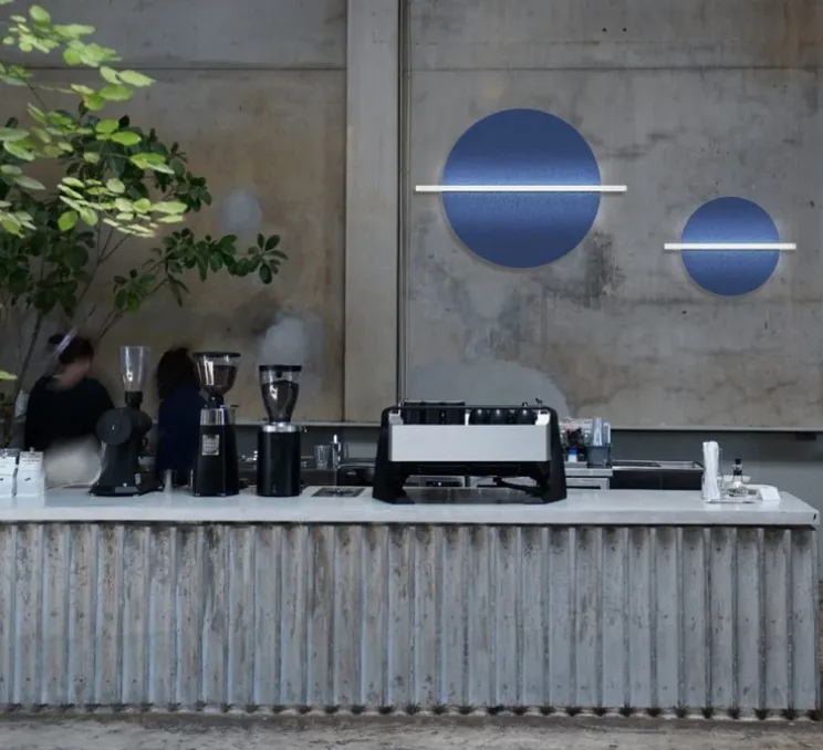 Découvrez l’applique ronde large Hang Out, finition bleu clair et blanc imaginée par le Studio Brogliato Traverso pour la maison italienne Penta.