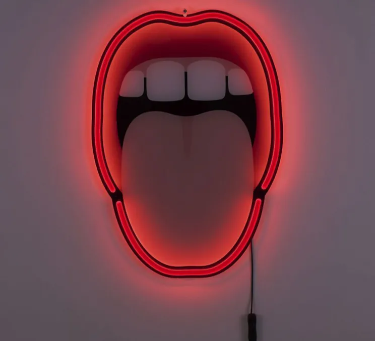 Tongue est une applique en forme de bouche ouverte, tirant la langue. Un néon suit les contours de la forme en acrylique en créant un halo lumineux. Graphique et impertinente, Tongue s’intègre dans les espaces publics et privés, que ce soit dans un salon, une entrée ou une chambre.
