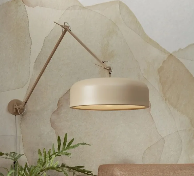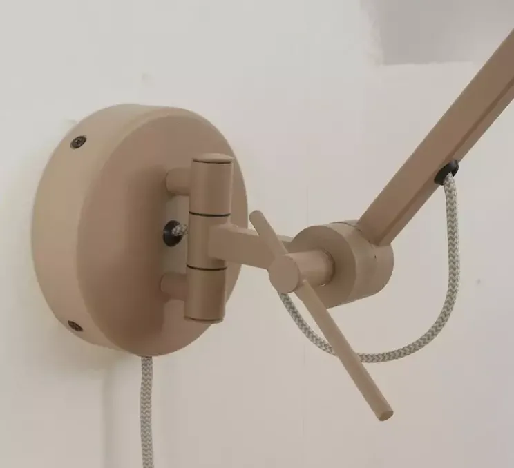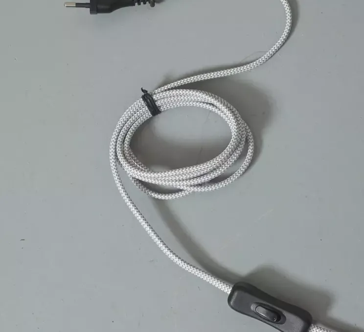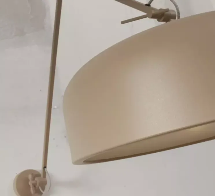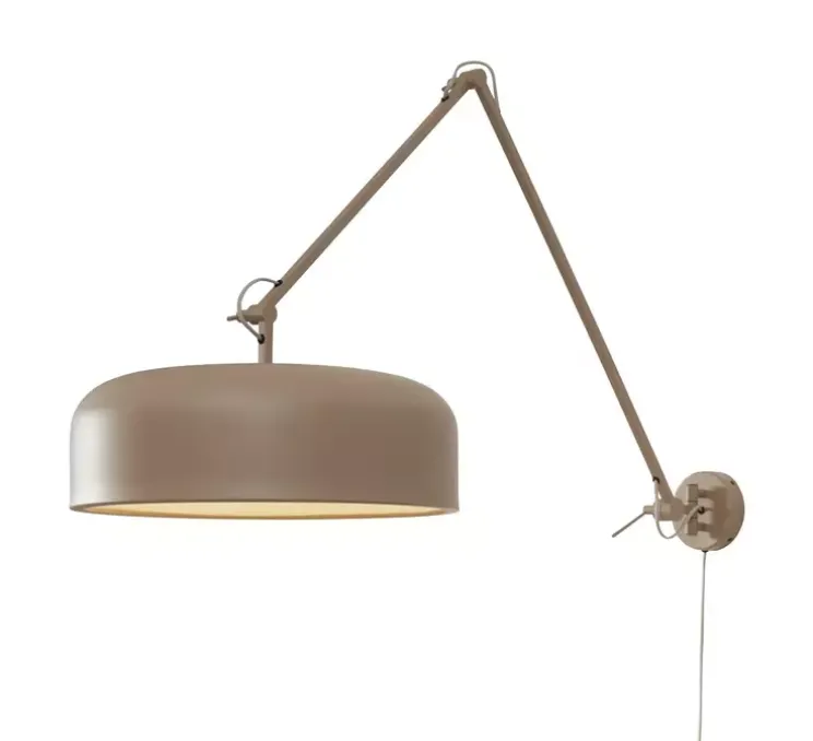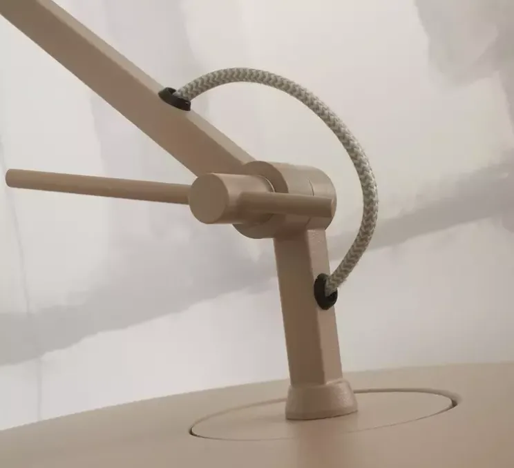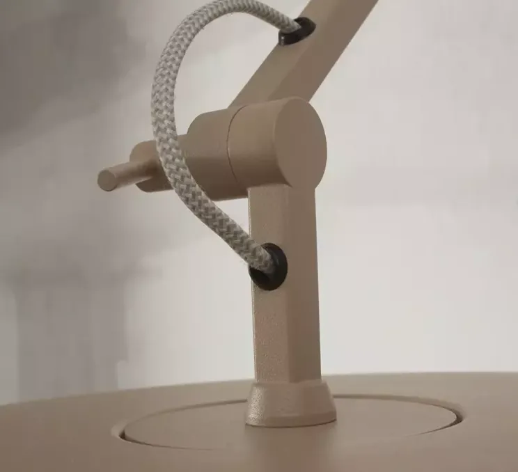 L’ abat-jour mesure 48cm de diamètre et 17cm de hauteur, le bras est articulable jusqu’à 130cm. Un câble en textile gris, mesurant 2 mètres, est fourni.
