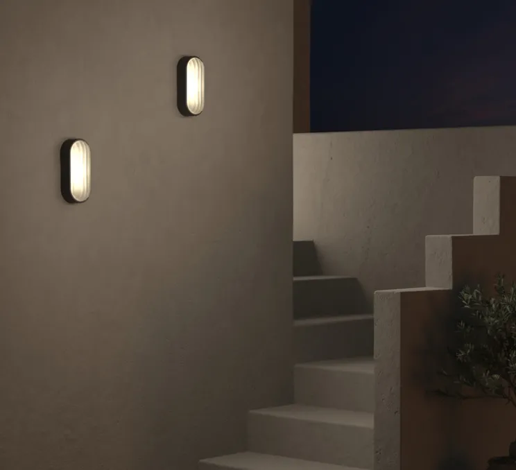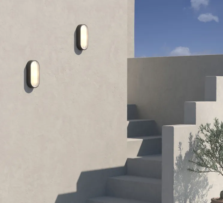 Découvrez l’applique murale d’extérieur Montréal Oval, finition noir texturé, imaginée par le studio de la maison britannique Astro.
