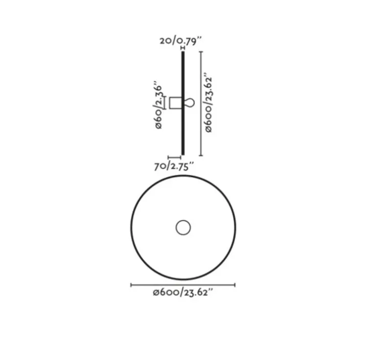 L’applique murale 600 H70 mesure ⌀60cm et 7cm de hauteur. L’ampoule LED n’est pas incluse, favorisez une ampoule E27 avec une puissance maximale de 15W. Driver non requis et non dimmable. La base est en acier avec un coloris noir. L’indice de protection est IP20, autrement dit, l’applique murale s’installe uniquement en intérieur.