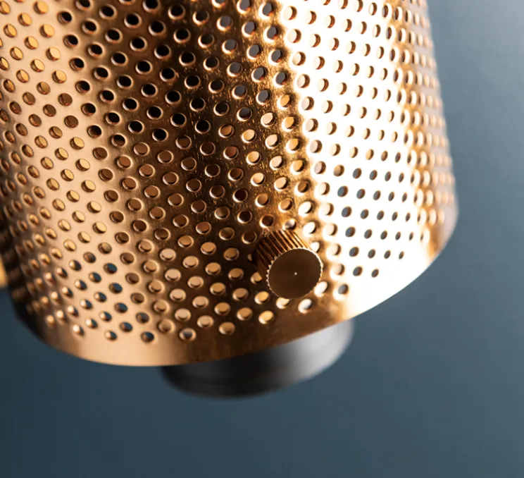 Entourant une ampoule crépitante, les plaques d’acier perforées de Pilsen, revêtues de laiton, contrastent avec un bronze si profond qu’il en est presque noir. D’autres perforations et détails unifient l’appliques, tandis que les courbes lisses et les bords durs ajoutent encore plus de contraste visuel à ce luminaire saisissant et harmonieux.