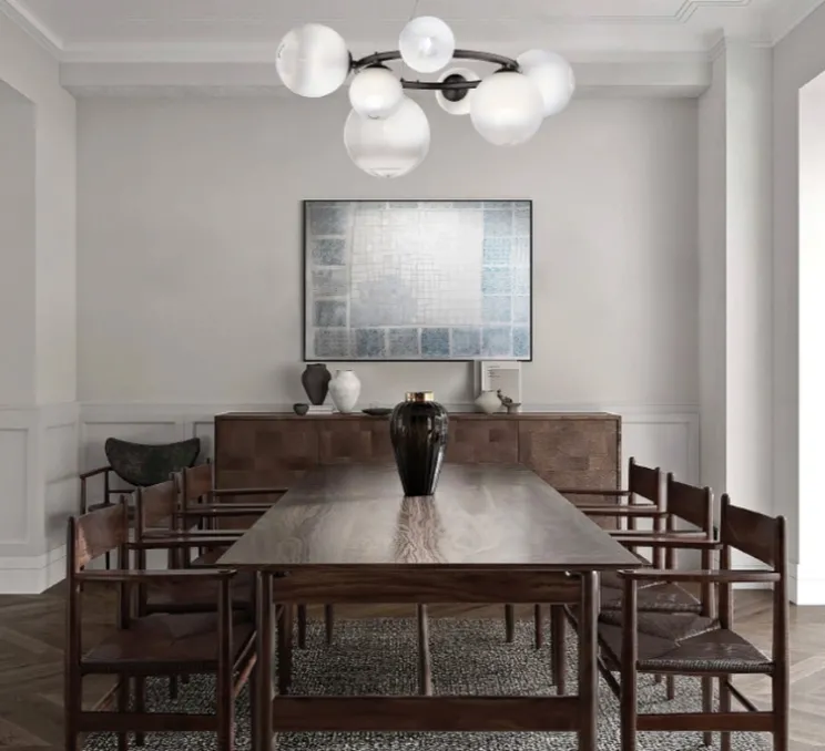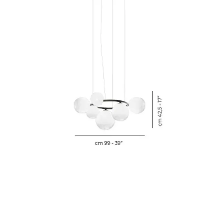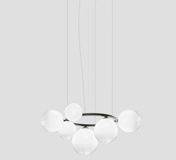 Composée de sept sphères en cristal transparent, fixées sur une structure en métal noir mat, cette applique murale joue sur le contraste des matières. Les diffuseurs, striés de manière irrégulière, créent un jeu de lumière délicat et diffus. Idéale au-dessus d’un canapé, dans une salle à manger ou sur un mur de circulation, Puppet Ring SP 7A structure l’espace tout en restant visuellement légère. Son design modulaire permet d’associer plusieurs modèles pour des compositions murales sur-mesure.