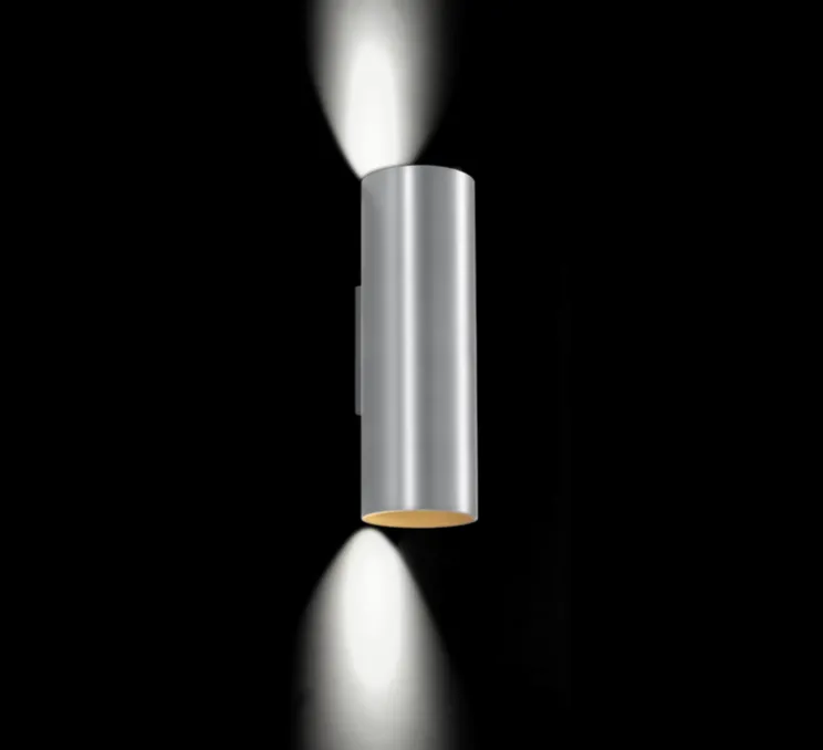 Les dimensions de l’applique murale sont de 20 cm de hauteur et 6,7 cm de diamètre. Disponible en différents coloris (noir, blanc, cuivre et aluminium brossé) et en différentes tailles avec ou sans le système LED.