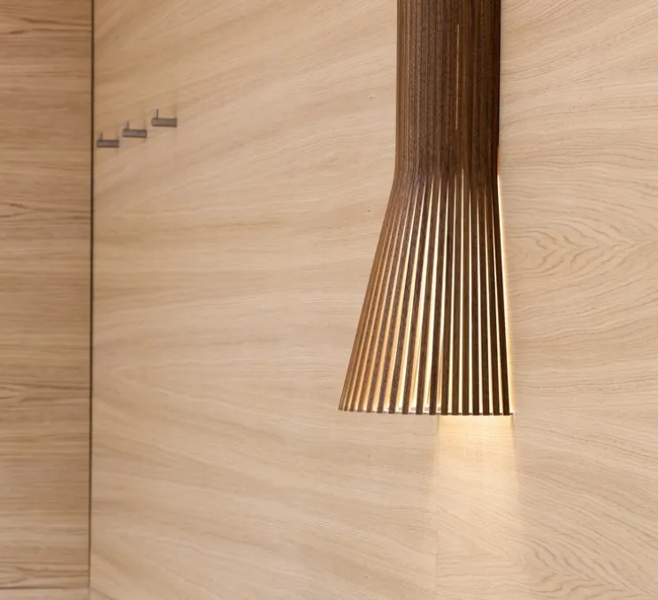 Cette lampe scandinave au design simple est composée de lamelles de bois et contreplaqué de bouleau certifié PEFC, un matériau écologique. Elles sont reliées à une structure légère en contreplaqué utilisé pour l’aviation.