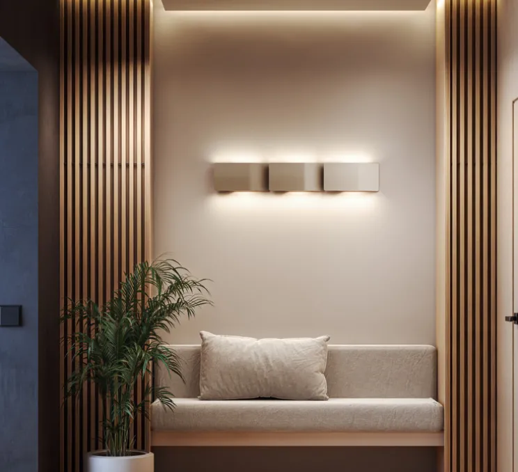 L’applique asymétrique latérale maintient une harmonie visuelle compacte et cohérente. Son caractère unique apporte du dynamisme sans compromettre l’équilibre esthétique de l’ensemble. Elle permet de multiples configurations dans des positions verticales, horizontales ou combinées qui créent des figures sur le mur. Son design permet également l’intégration d’une signalétique dans son écran frontal pour indiquer des directions ou fournir des références visuelles claires, donnant ainsi une double fonctionnalité à ce luminaire.