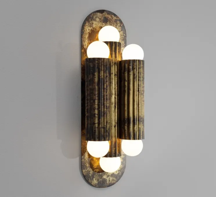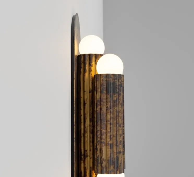 Elle se compose de trois cylindres superposés en laiton travaillé, chacun orné de chaque côté d’un globe en verre, reposant élégamment sur une base murale. Sa silhouette évoque à la fois la verticalité rythmée des cannelures grecques et la fluidité des drapés antiques, transformant le métal en mouvement et la lumière en poésie. Inspirée par Vesta, déesse romaine du foyer, cette applique incarne chaleur, protection et grâce intemporelle, tout en révélant le savoir-faire artisanal de Schwung à travers ses finitions patinées uniques.