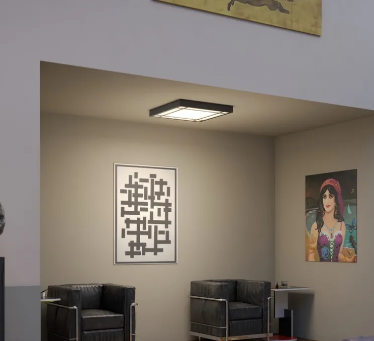 Le luminaire mesure 60 cm de longueur et de largeur, 10 cm de profondeur.