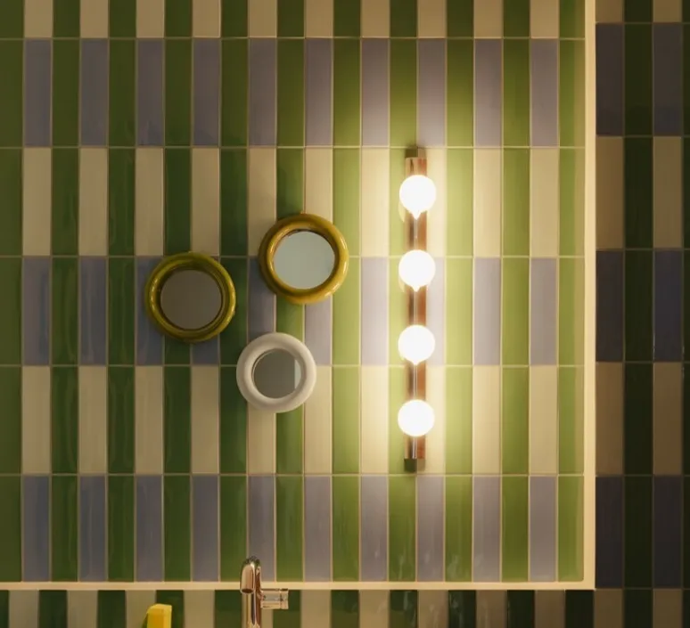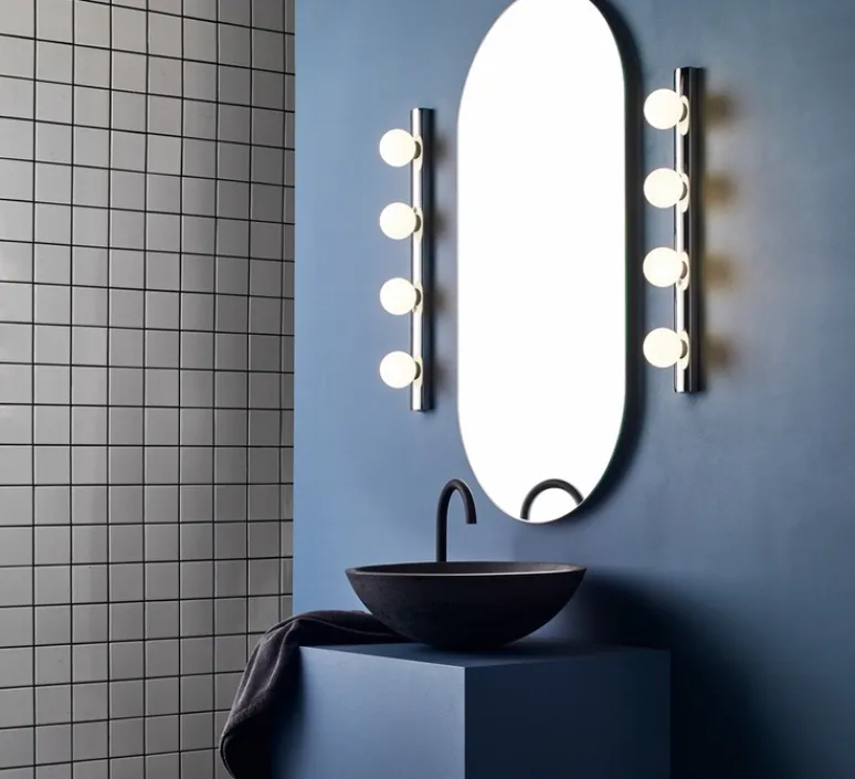 L’applique de salle de bain Cabaret 4 peut être posée à la verticale ou à l’horizontale. Elle mesure 55cm de long et 9 cm de profondeur.