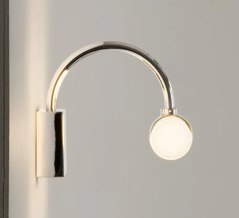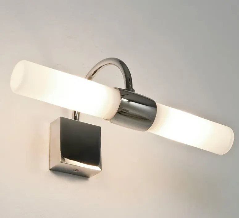 Dotée d’un bras en chrome poli et d’un double abat-jour cylindrique en verre opalin, elle adopte une ligne légèrement arquée, inspirée des appliques de salle de bains classiques mais revisités avec élégance contemporaine.