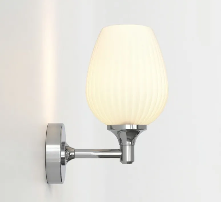 Ce modèle mural en métal chrome poli, doté d’un abat-jour en verre opalin, combine design décoratif et exigence technique pour répondre aux environnements humides.