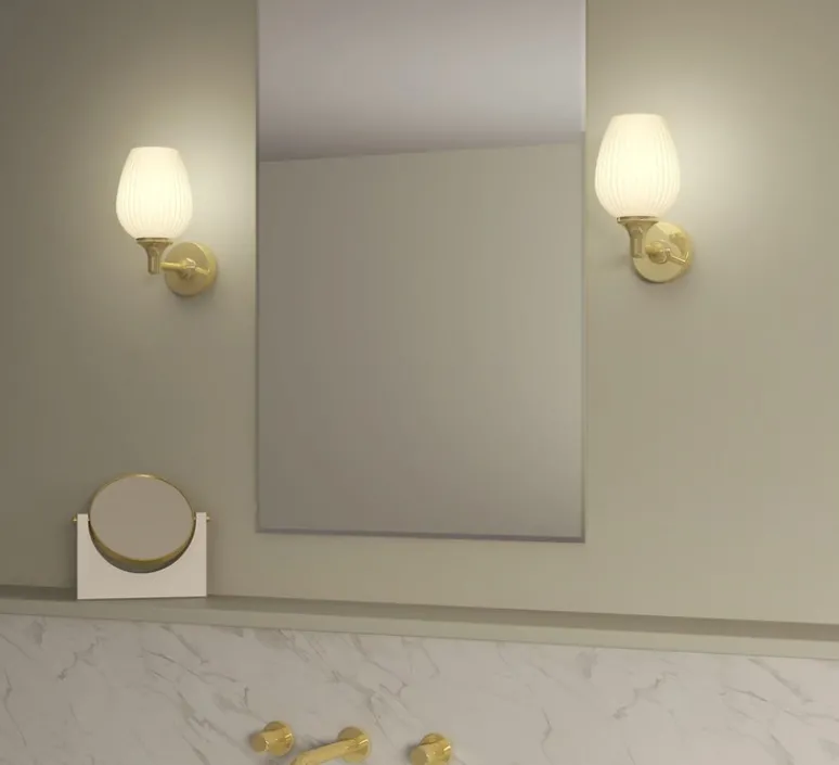 Ce modèle mural en métal laiton poli, doté d’un abat-jour en verre opalin, combine design décoratif et exigence technique pour répondre aux environnements humides.