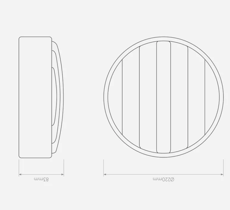 L’applique Montréal Round 220 mesure 22 cm de diamètre et 8,3cm de profondeur. L’ampoule LED E14 d’une puissance maximale de 7W n’est pas fournie mais est recommandée pour le bon fonctionnement du luminaire. Driver non requis. Montage mural vertical.