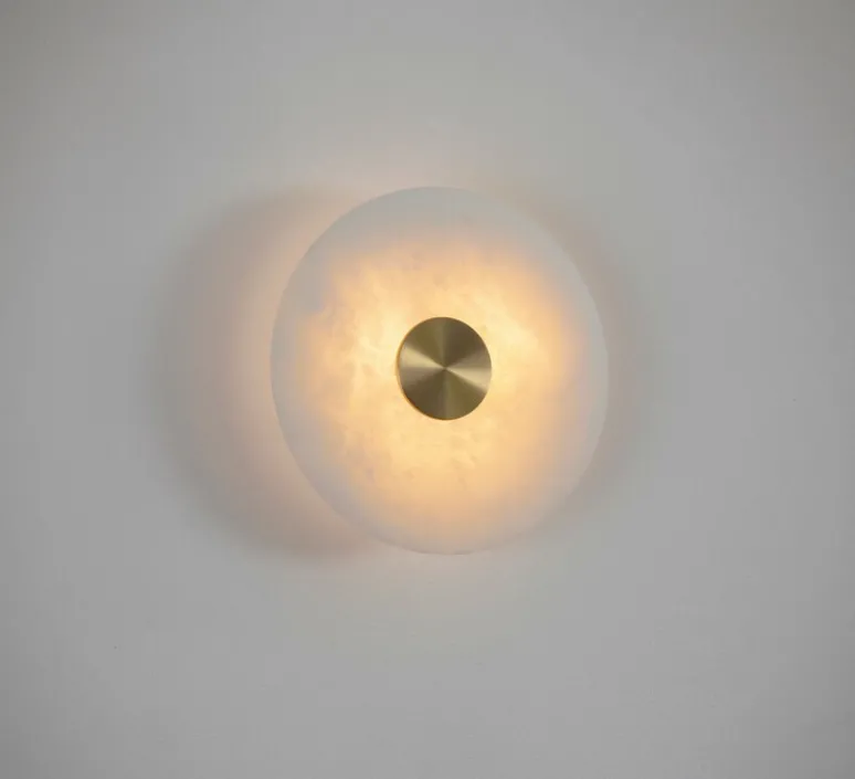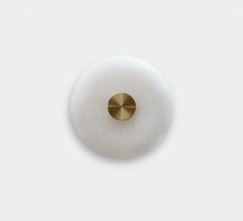 L’applique murale Bide 450 arbore un design circulaire élégant avec un diamètre de 45 cm pour une profondeur de 6 cm. Son fini en laiton confère une touche de sophistication à tout espace, tandis que sa base en albâtre apporte légèreté et douceur à l’esthétique globale.