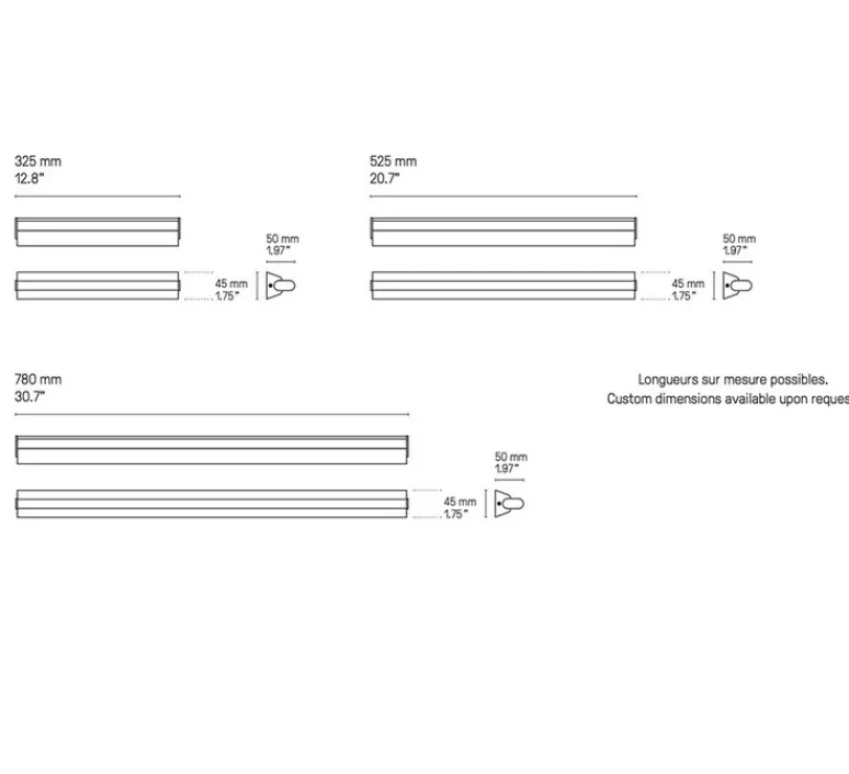 Elle mesure 32,5cm de longueur, 4,5cm de hauteur et 5cm de profondeur. Le module Led intégré diffuse 300 lumens avec une colorimétrie de 3000K. Non dimmable en standard.