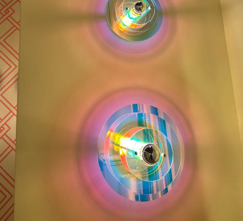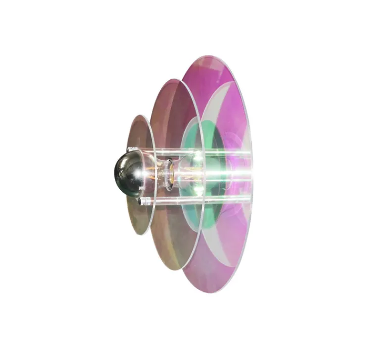 Son verre irisé capte la lumière et la projette en reflets délicats sur le mur, créant une atmosphère en constante évolution selon l’heure de la journée. De forme circulaire, avec trois disques de tailles différentes, cette applique évoque un halo mouvant, rappelant la suspension Venise.