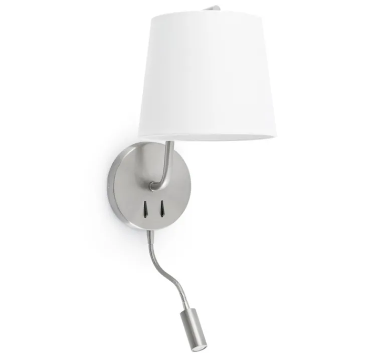 Le luminaire Berni se compose d’une liseuse LED orientable qui procure un éclairage optimal et précis qui vous permet de lire en toute tranquillité sans avoir besoin d’une lampe de chevet à côté de votre lit ou de votre bureau. Cet éclairage est idéal en tête de lit dans les hôtels ou dans une chambre à coucher. L’association du métal et du textile apportera à votre pièce une allure contemporaine et distinguée inégalable.