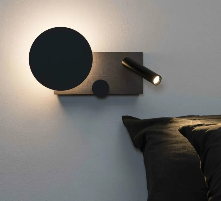 C’est une applique en gris texturé conçue par Isaac Piñeiro. Elle possède une liseuse réglable sur le côté droit, et une lumière indirecte qui est projetée à travers le faisceau lumineux circulaire. La lumière indirecte est réglable et actionnée à l’aide d’un interrupteur visible sur la structure. Elle peut être installée verticalement ou horizontalement.