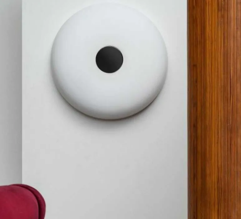Tropico est une calotte sphérique en verre opalin opaque, aplatie et fixée par un grand bossage en métal miroir. La famille comprend des versions mur/plafond et table, toutes deux disponibles en trois tailles différentes.