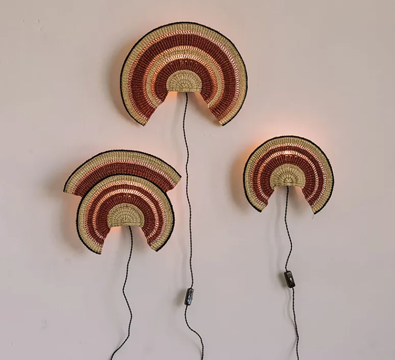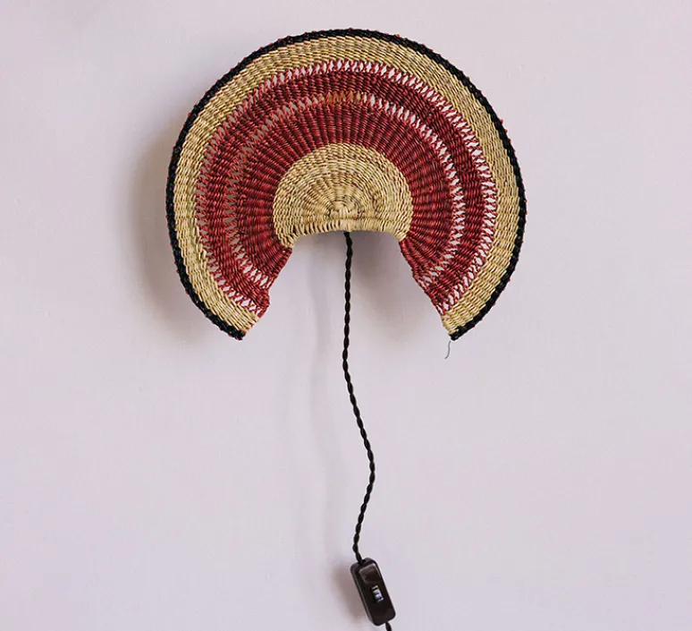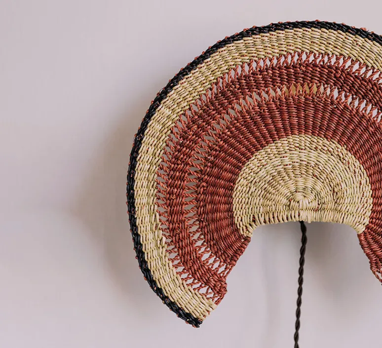 Le luminaire Admirador se compose d’une base murale avec câble et interrupteur et d’un abat-jour tissé plat, dont la forme reprend la forme du classique éventail Bolga. L’abat-jour est tissé à la main par des artisans selon l’art du tissage Bolga, artisanat typique de la région de Bolgatanga dans le nord du Ghana. Le matériau utilisé pour le tissage est une herbe, l’herbe Veta Vera : elle est cultivée localement et récoltée pour ensuite être torsadée et tordue, jusqu’à créer des fibres résistantes et lisses, qui seront finalement teintes avec des pigments naturels. Le rythme du tissage laisse passer les rayons de la lumière, pour apporter une touche de douceur et de naturel à chaque intérieur. Naturelle et belle, l’applique Admirador s’installe aussi bien dans une chambre, que dans un couloir ou d’une pièce de vie.