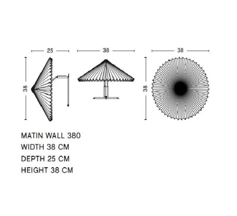 Matin propose un design à la fois contemporain et poétique, avec une construction qui allie finesse visuelle et robustesse physique. La lampe comprend un support en acier pour le montage au mur, et est recouverte d’un abat-jour en coton plissé lavande.