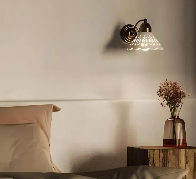 Classique et minimaliste, c’est dans les détails que se révèle l’élégance de l’applique murale Fior Di Pizzo 17. Elle se compose d’un abat-jour en céramique ajouré au motif floral, et rattachée à la fixation par un bras en laiton brut. Les ouvertures sur l’abat-jour s’inspirent de la broderie pour lui donner l’aspect de la dentelle. Elles permettent aussi de projeter des ombres de fleurs aux alentours lorsque l’applique est éclairée.