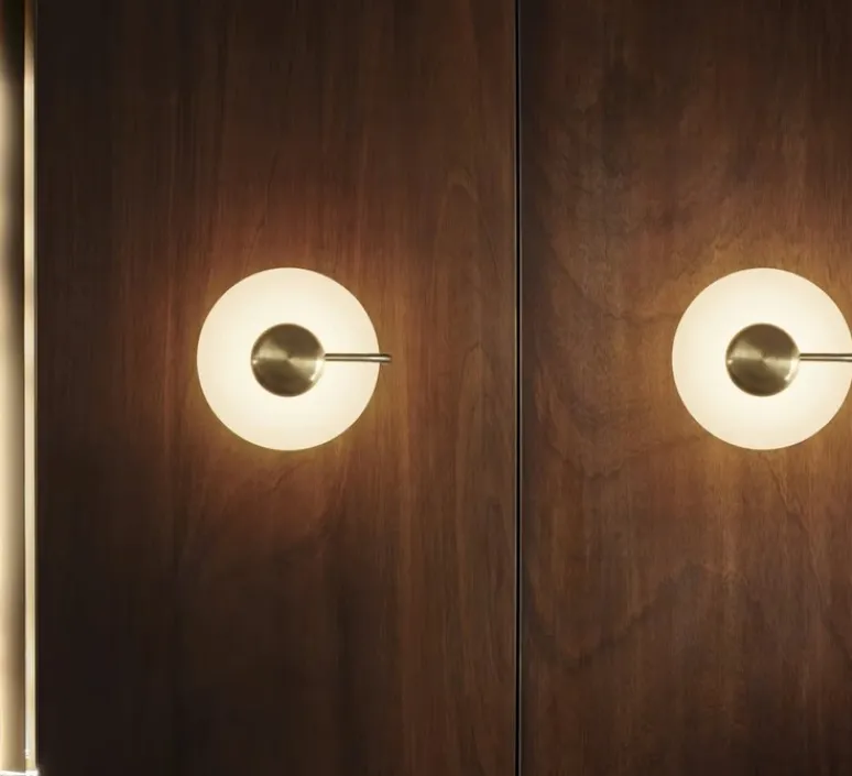 Sa structure en métal peint laiton dessine une ligne discrète mais expressive qui s’intègre avec justesse sur tous types de murs. Le diffuseur en verre opalin offre une lumière douce, tandis que la forme circulaire de l’applique crée un relief subtil de lumière et d’ombre. Tratto se pose seule comme point d’accent ou se multiplie pour composer un rythme visuel décoratif dans un couloir ou un salon.