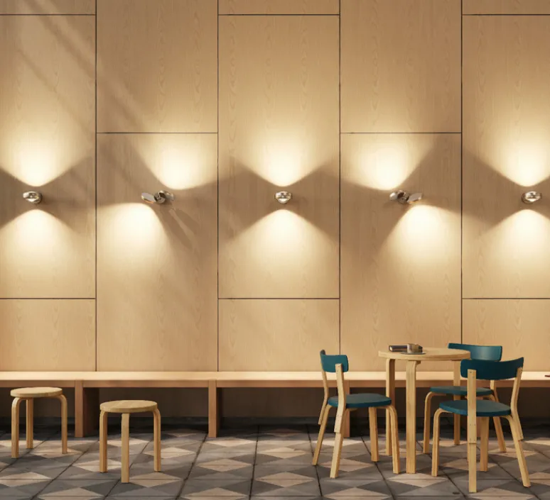 L’applique Nautilus Double intègre une source LED de 2700K avec un flux lumineux de 1990 lumens et un excellent rendu des couleurs (IRC >90). L’éclairage est confortable pour les yeux grâce à la lentille développée par Lodes.