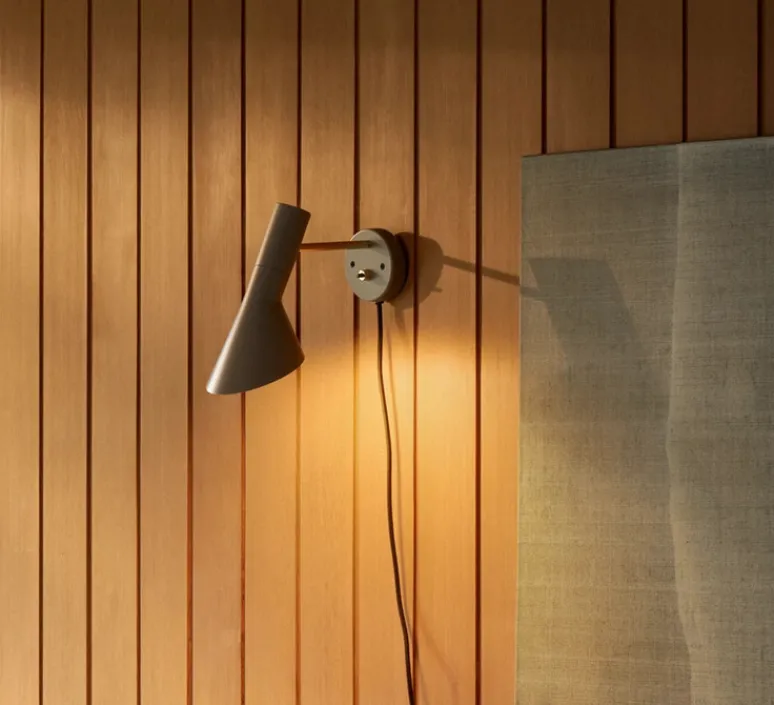 L’applique murale AJ avec câble et interrupteur est éditée par Louis Poulsen, sur un dessin d’Arne Jacobsen datant de 1957.
