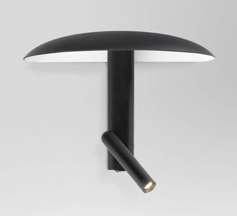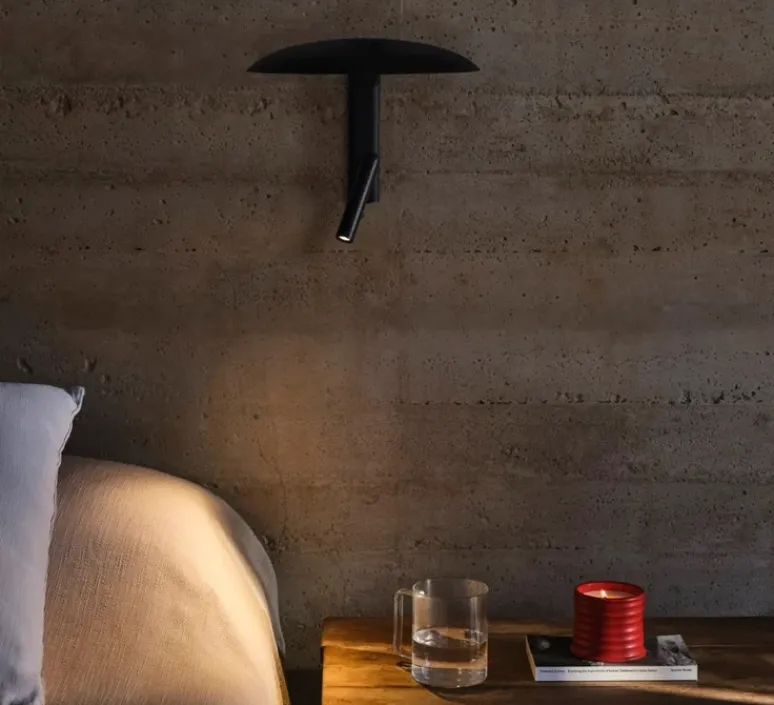 L’applique Konoha est composé d’une fixation centrale avec un spot liseuse à une extrémité et un abat-jour en forme de chapeau de l’autre. L’abat-jour permet de rediriger la lumière avec un faisceau plus doux. Le revêtement blanc agit comme un réflecteur pour créer une ambiance chaleureuse. Le spot est orientable à 360° pour offrir une lumière directe ou indirecte.