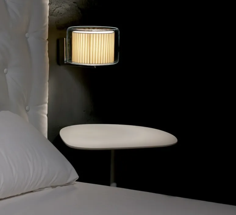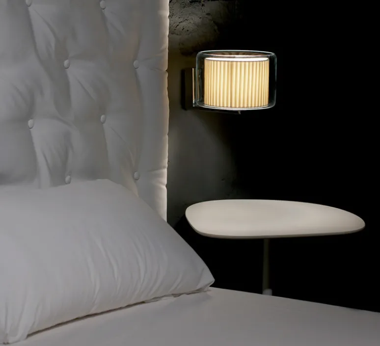 Le modèle Mercer propose ici une version particulièrement chic de l’applique classique avec un effet double-peau associant le verre soufflé et le textile élégamment plissé.