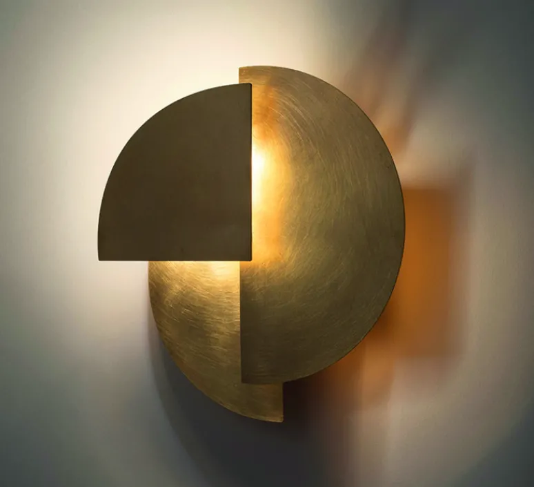 Pour cette applique, le laiton reste le matériau de prédilection puisque brossé, il se met au service d’une lumière douce et poli, il est à l’origine de vifs éclats…