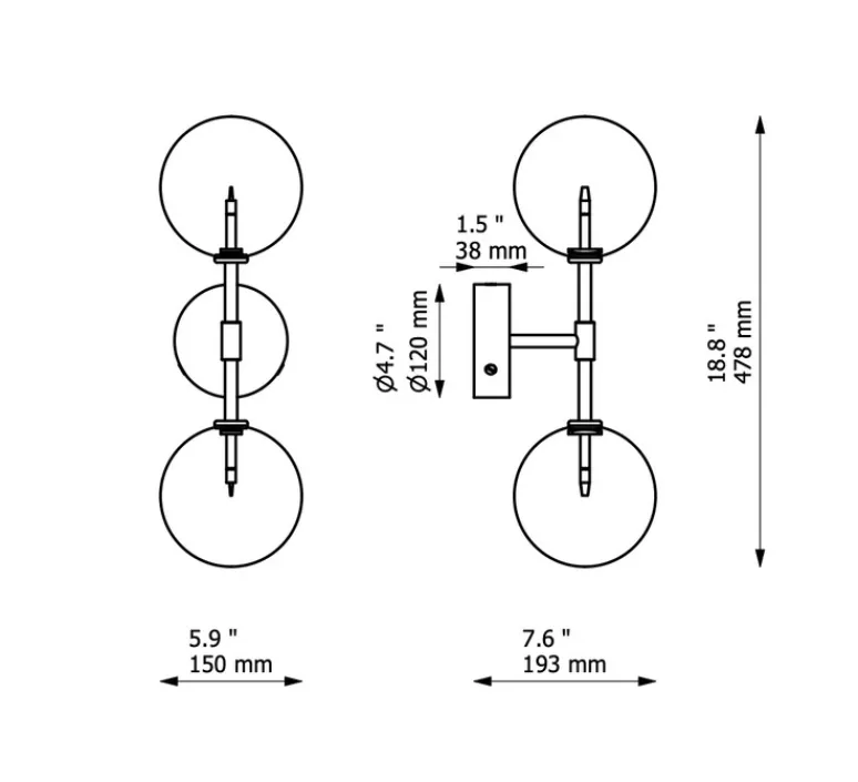 Existant en laiton de trois finitions différentes (laiton laqué bruni, gris acier, nickel poli), elle est conçue en laiton et se compose de globes en verre soufflé à la main.